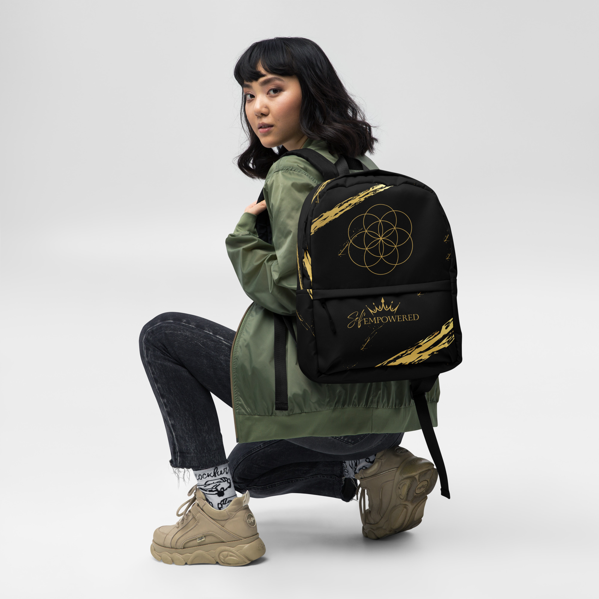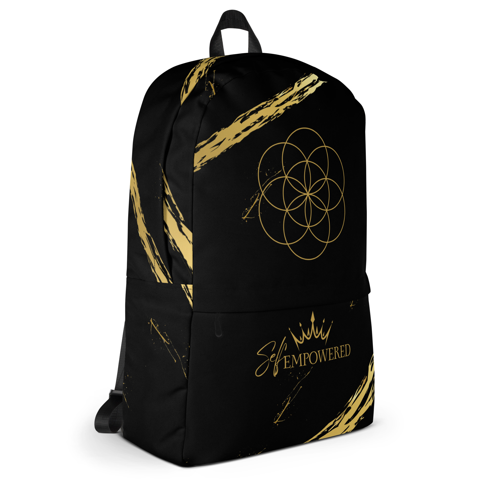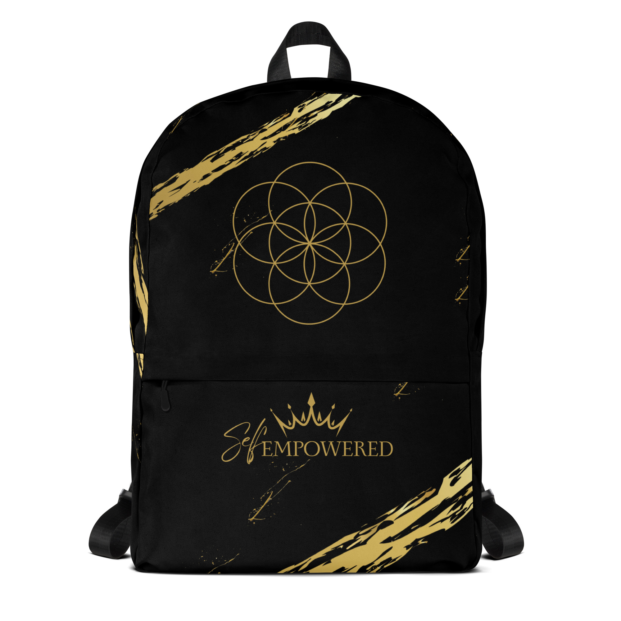 This bold black backpack is more than just a carryall—it’s a sacred vessel for your daily journey. Adorned with the Seed of Life sacred geometry at the crown of the bag, it symbolizes the infinite potential within you. Along the front pocket, the empowering words “Self-Empowered” sit beneath a crown—an embodied reminder that every step you take is a declaration of your divine sovereignty.