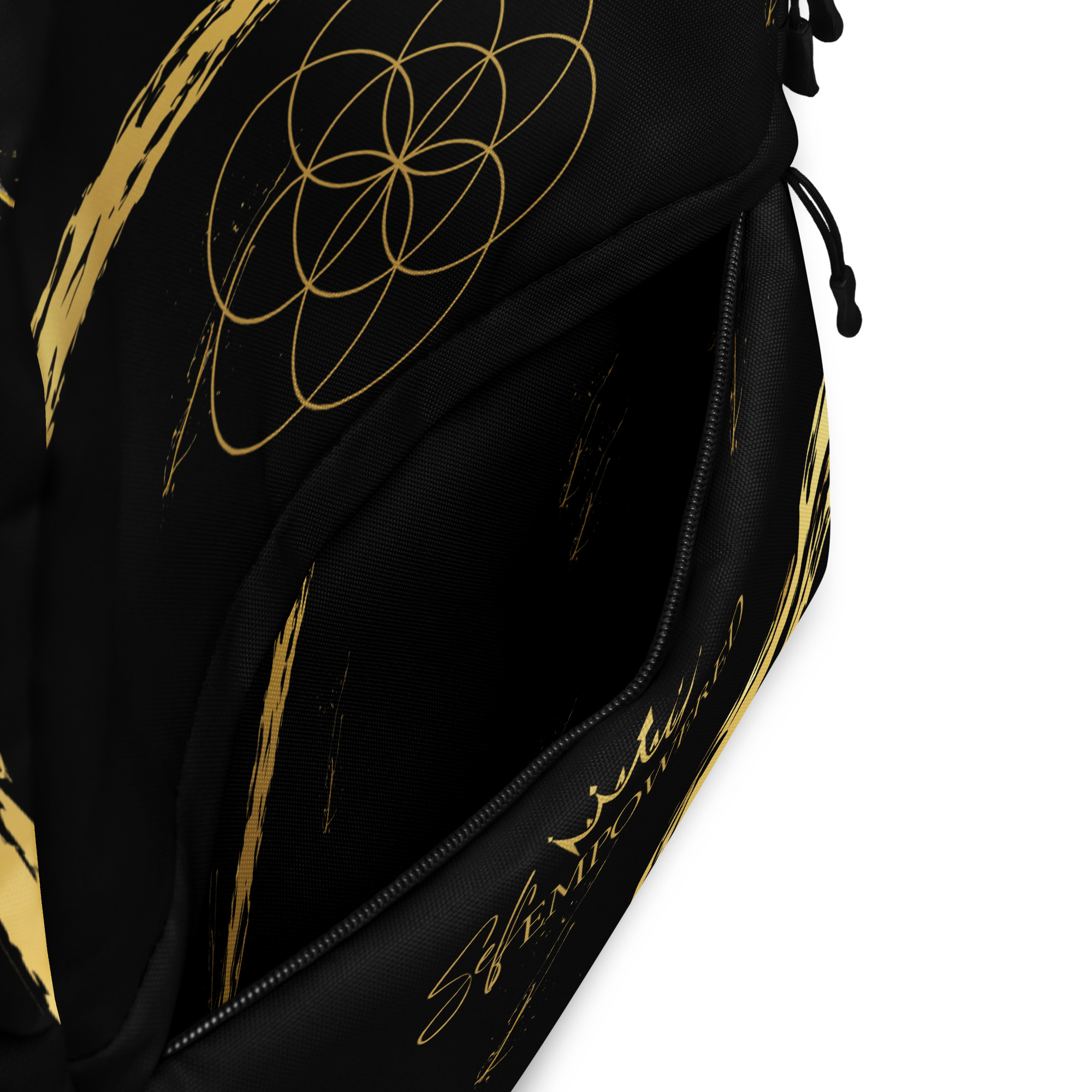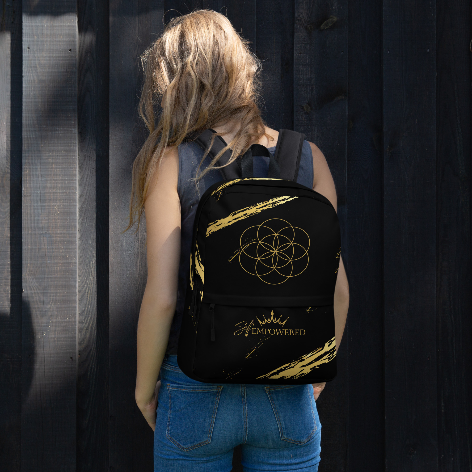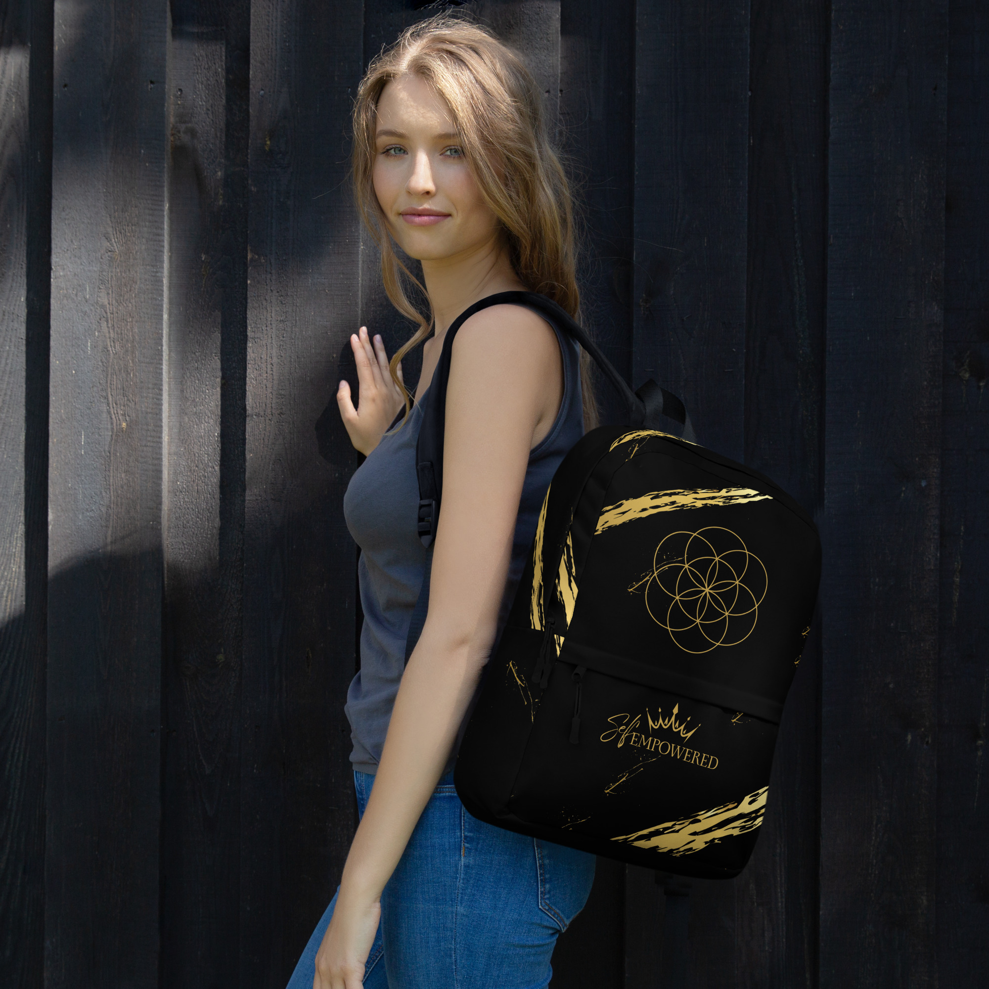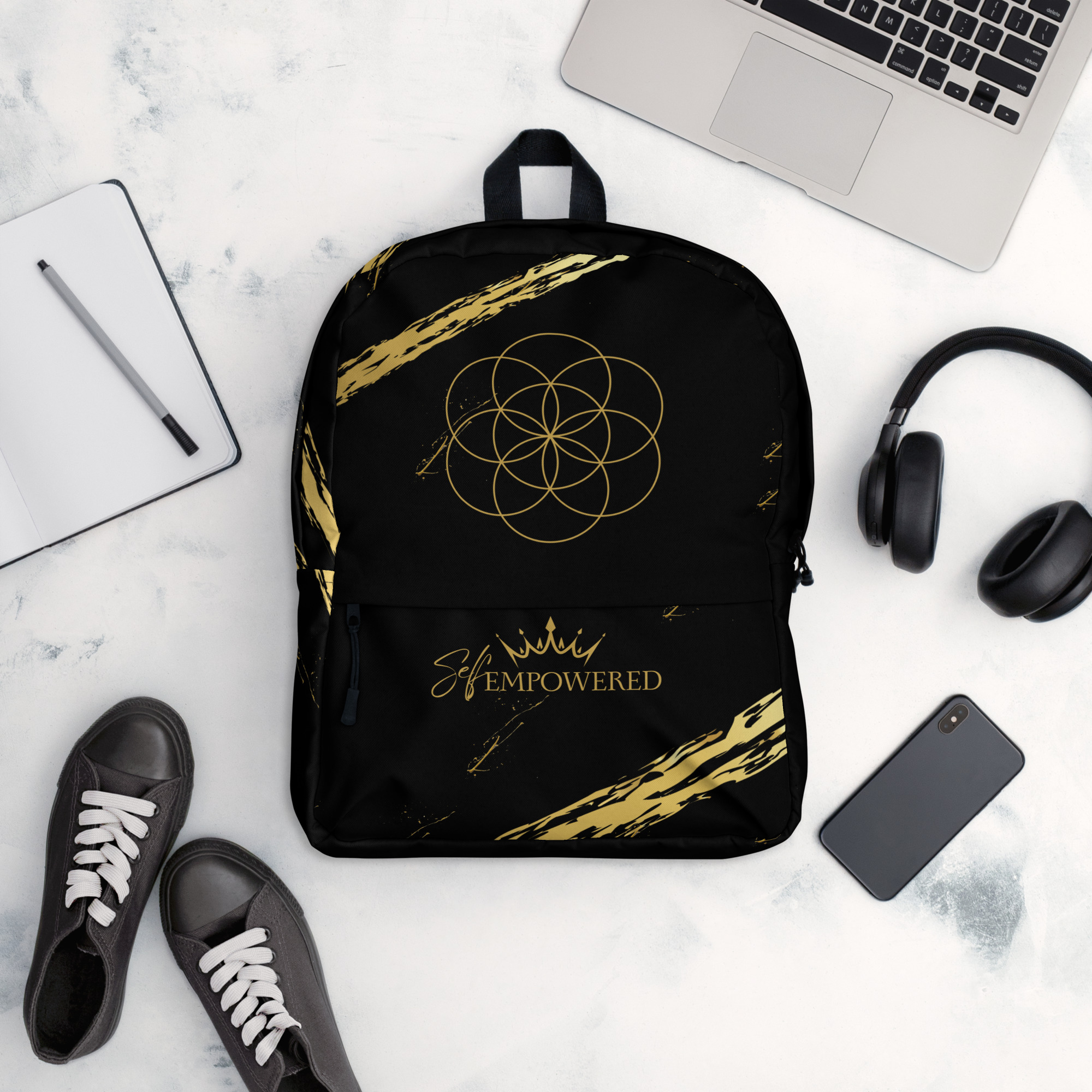 This bold black backpack is more than just a carryall—it’s a sacred vessel for your daily journey. Adorned with the Seed of Life sacred geometry at the crown of the bag, it symbolizes the infinite potential within you. Along the front pocket, the empowering words “Self-Empowered” sit beneath a crown—an embodied reminder that every step you take is a declaration of your divine sovereignty.